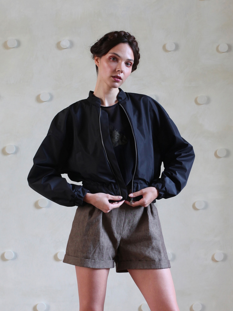 Bundička do pasu v černé barvě.  Na předním díle jsou dvě výpustkové kapsy. Zapínání na zip. Bunda je celá vypodšívkována. Rukávy jsou ukončeny manžetou se všitou gumou.