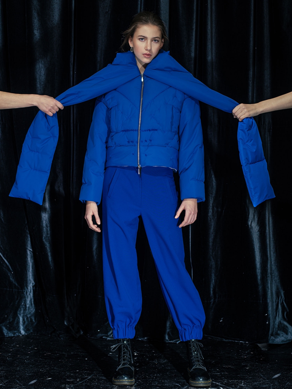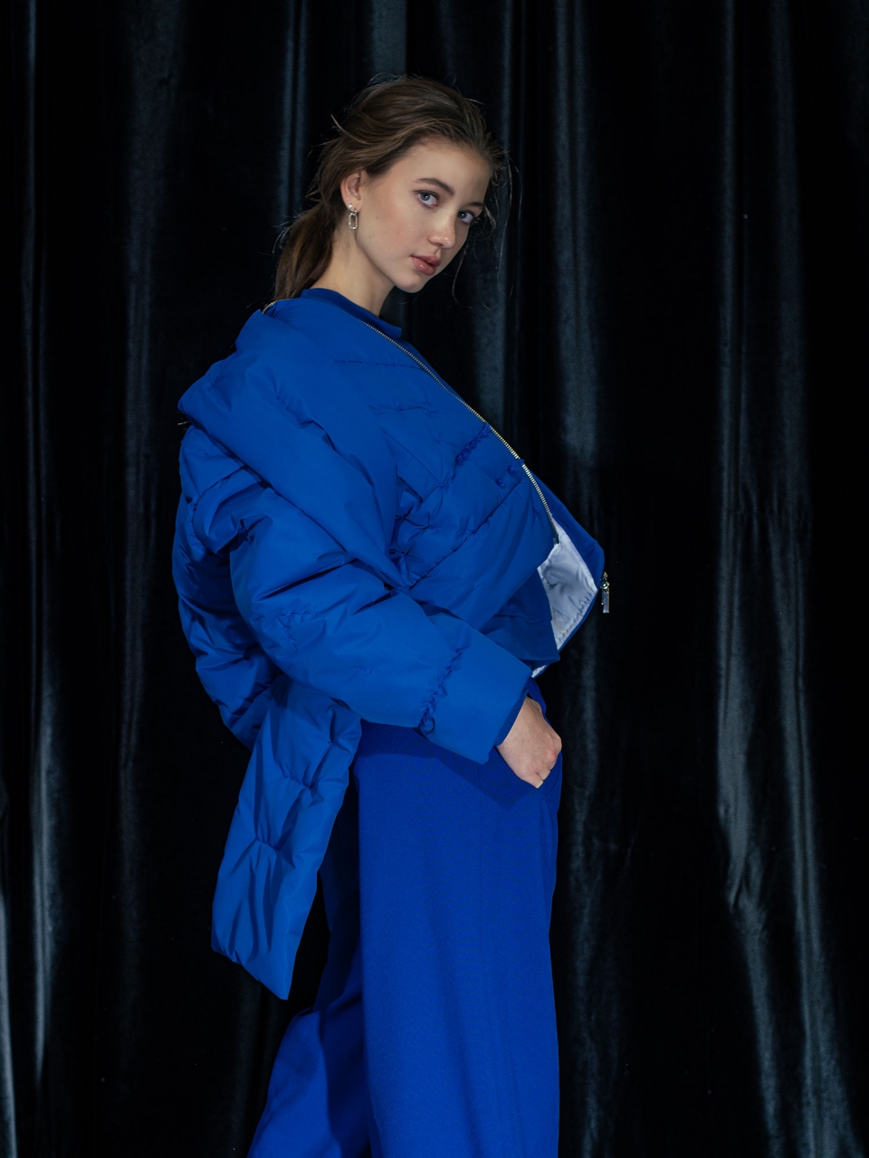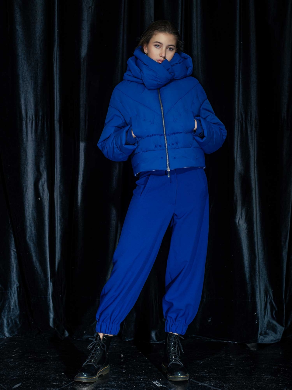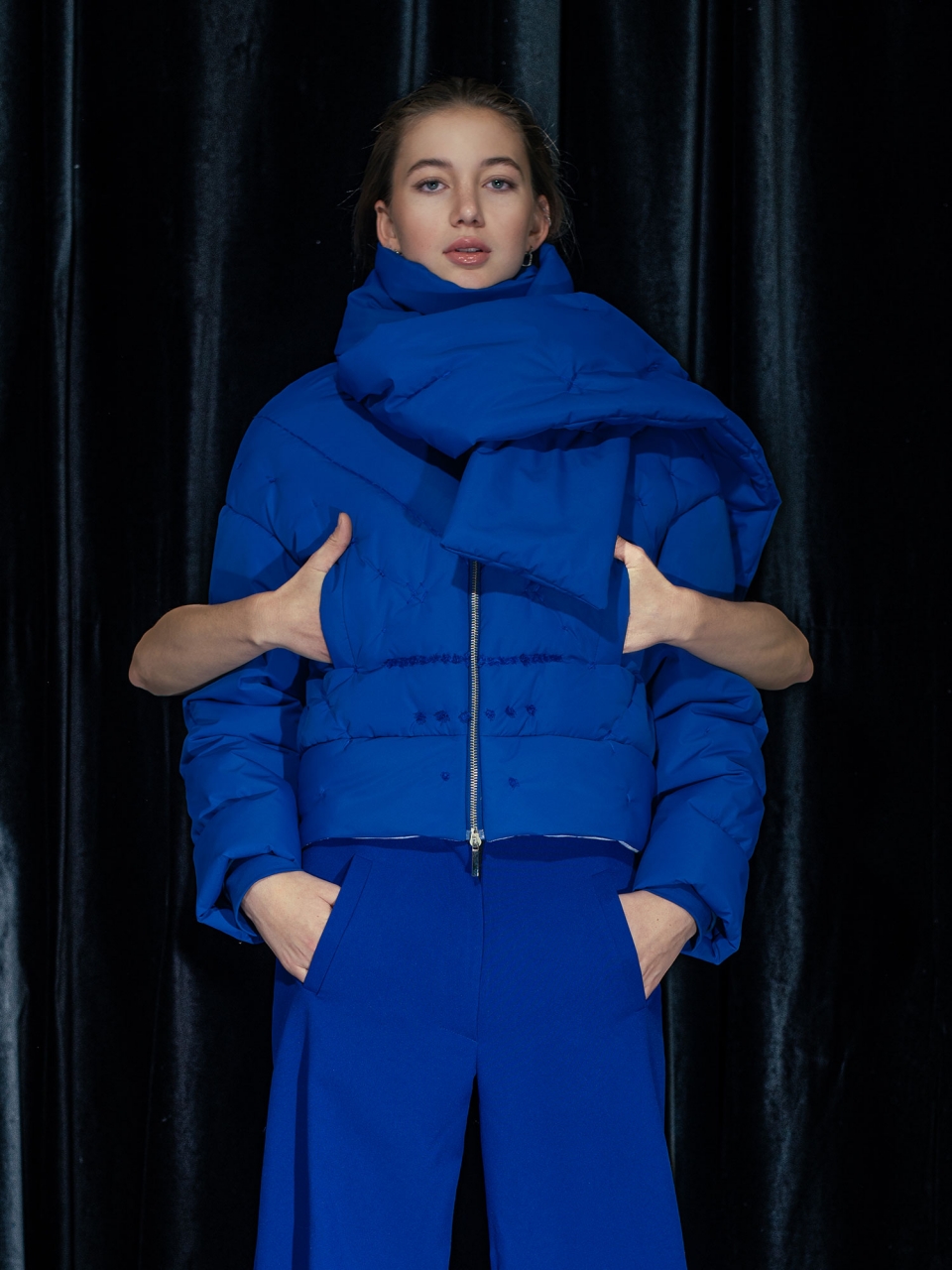 Bunda z nepromokavého materiálu s výplní z dutého vlákna. Střih bundy do pasu s všitou šálou u krku.