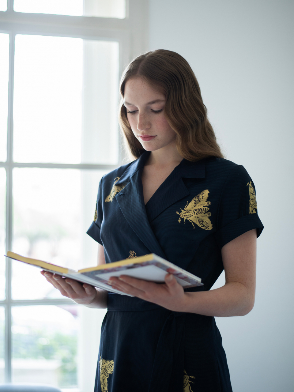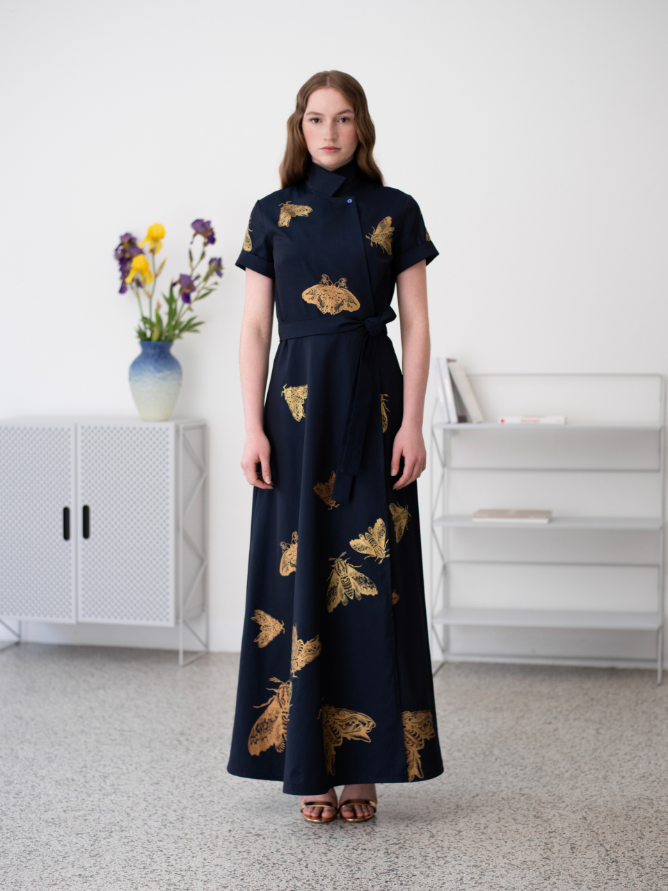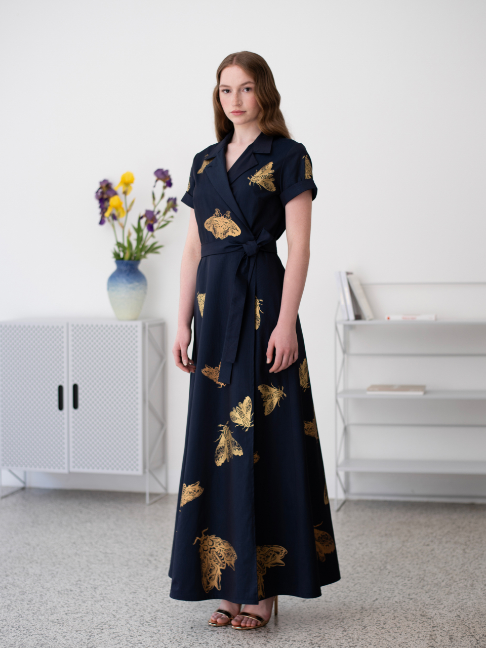 Dlouhé tmavě modré zavinovací šaty s potiskem Můry zlatou barvou.