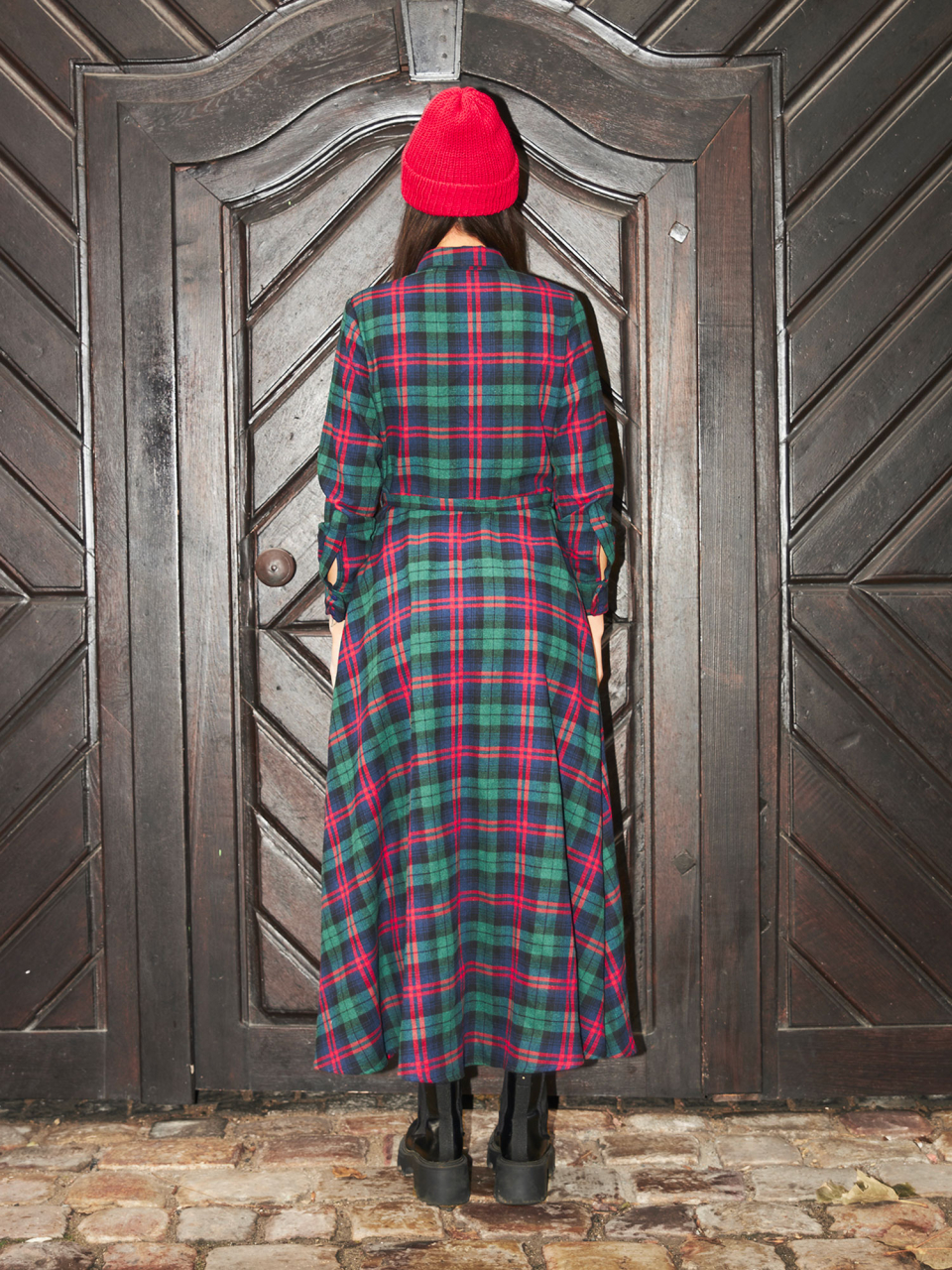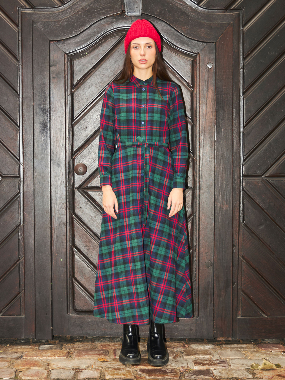 Košilové propínací šaty v nadčasovém zeleno-modro-červeném káru. Model je doplněn perleťovými knoflíčky po celé délce předního zapínání. Dlouhé rukávy jsou zakončeny tvarovanými manžetami, které šatům dodávají jemný, propracovaný detail. Praktické boční kapsy jsou skryté v postranních švech.