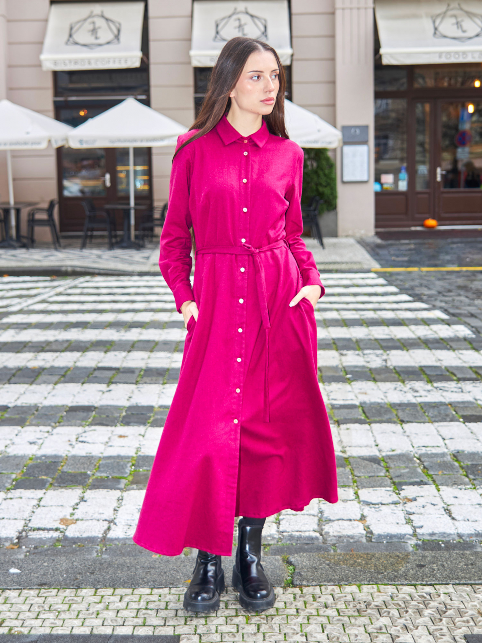 Košilové propínací šaty v elegantní purpurové barvě. Model je doplněn perleťovými knoflíčky po celé délce předního zapínání. Dlouhé rukávy jsou zakončeny tvarovanými manžetami, které šatům dodávají jemný, propracovaný detail. Praktické boční kapsy jsou skryté v postranních švech.