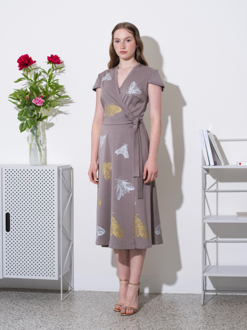 Zavinovací šaty v oříškové barvě se zlatým a perleťovým potiskem.