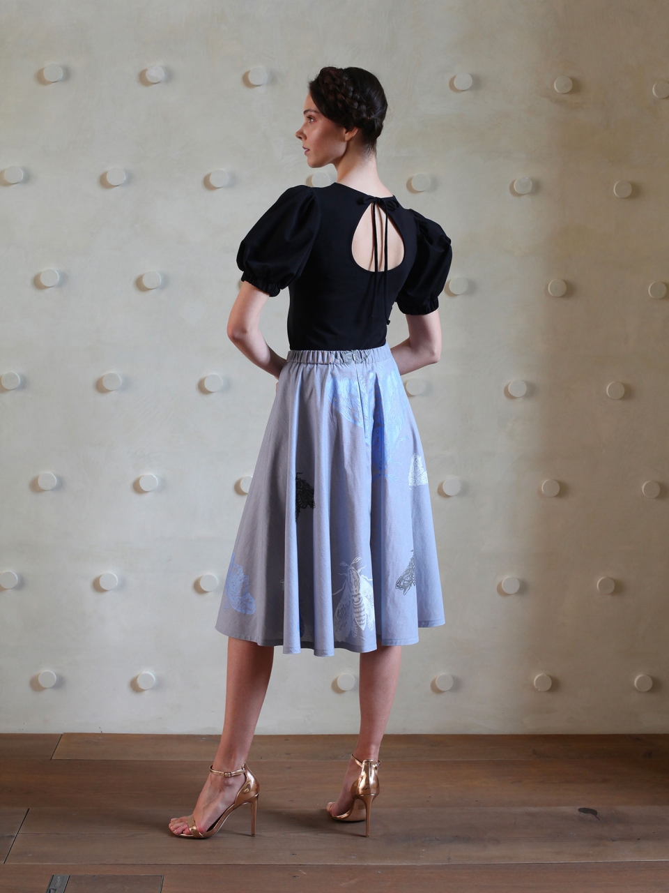 Světle šedá bavlněná sukně s potiskem Můry v antracitové, modré perleťové a bílé barvě.