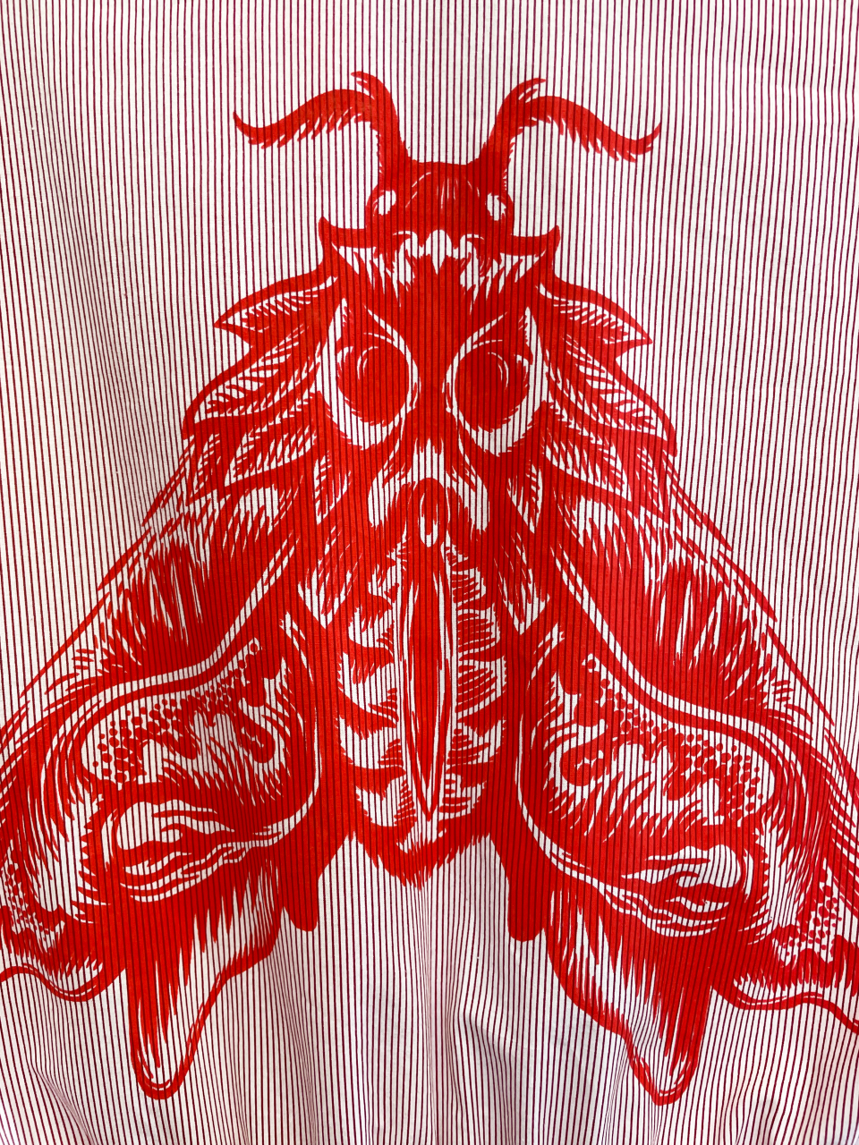 Šaty z příjemné bavlněné látky s jemným proužkem. Šaty jsou propínací s perleťovými knoflíčky. V bočních švech jsou kapsy. Potisk můry v červené barvě, na zádech je natištěna větší můra.
